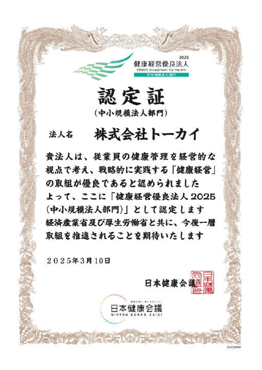 2025年3月 経済産業省 「健康経営優良法人2025」 中小規模法人部門 に認定されました。(2019より継続) 健康経営優良法人制度とは、地域の健康課題に即した取組や日本健康会議が進める健康増進の取組をもとに、特に優良な健康経営を実践している大企業や中小企業等の法人を顕彰する制度です。
