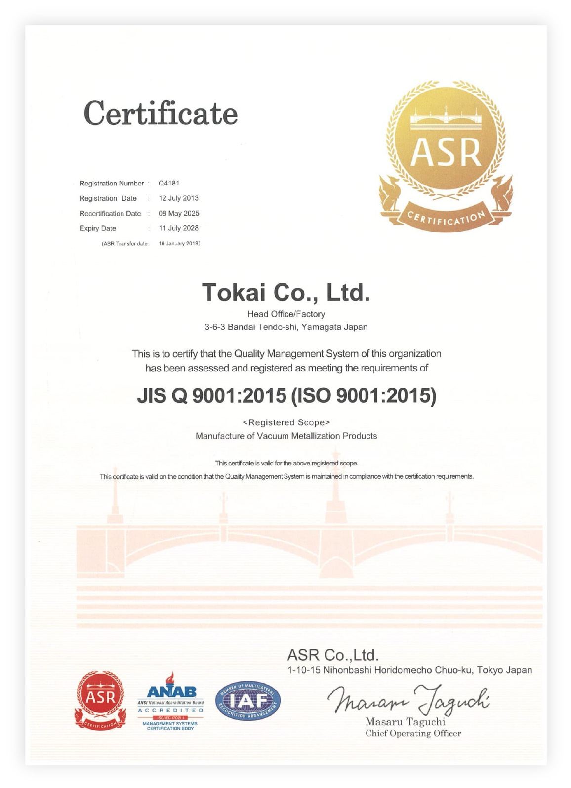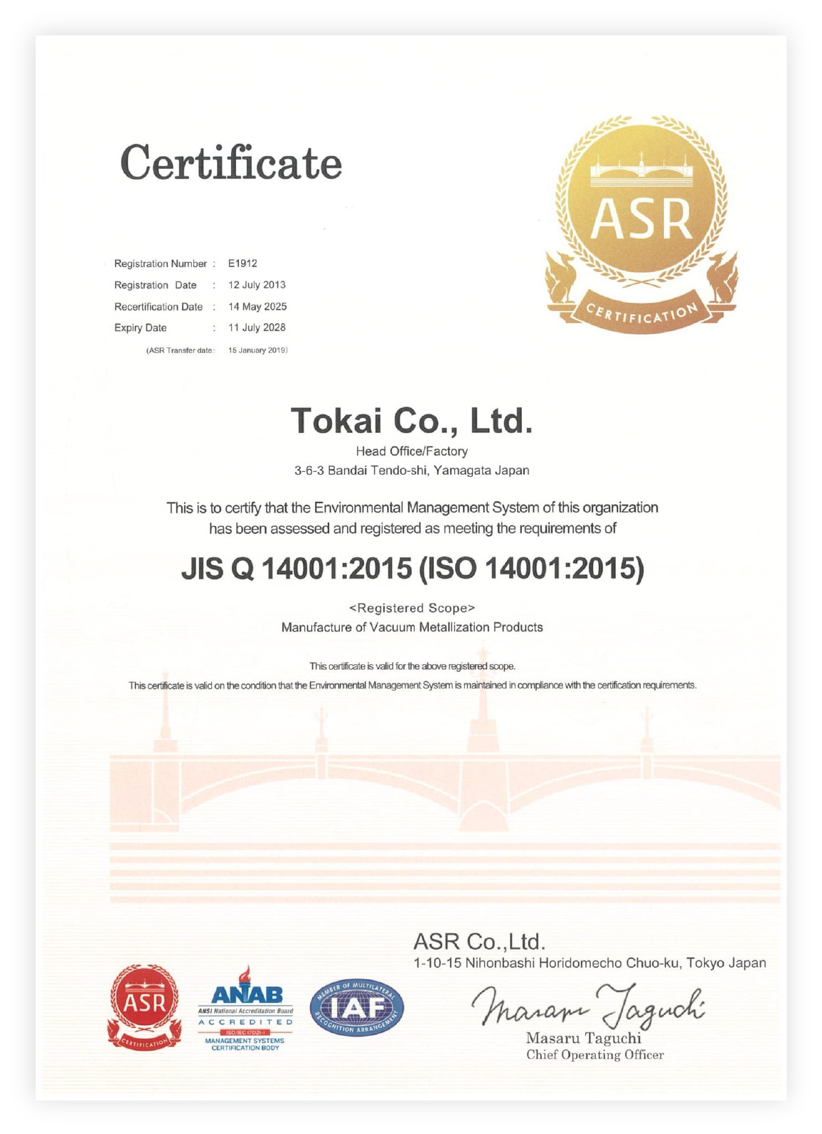 株式会社トーカイ本社工場では、品質マネジメントシステム・ISO9001と、環境マネジメントシステム・ISO14001の認定を取得しております。