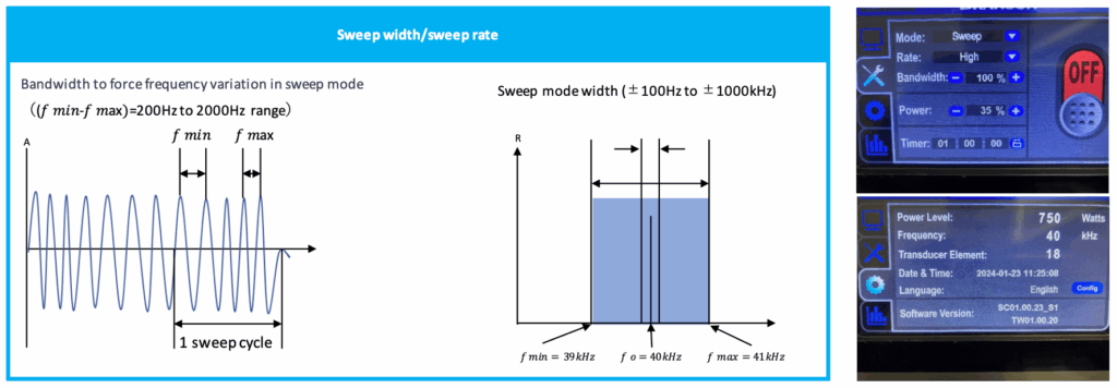 In sweep mode, the operating frequency changes over a ±1kHz range, resulting in a more uniform cleaning effect.