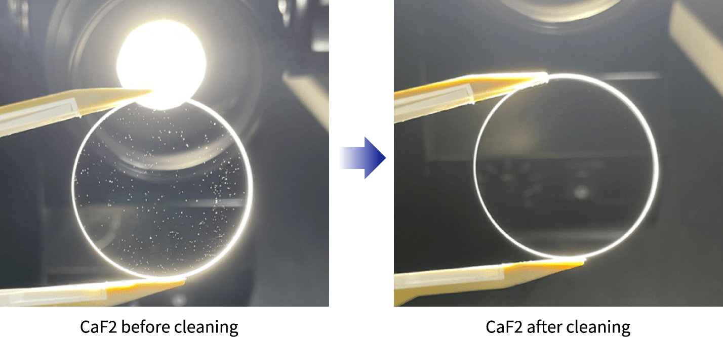 Up until now, cleaning of soft glass materials was generally done by hand wiping with a solvent, but our high-performance ultrasonic equipment has made cleaning possible.