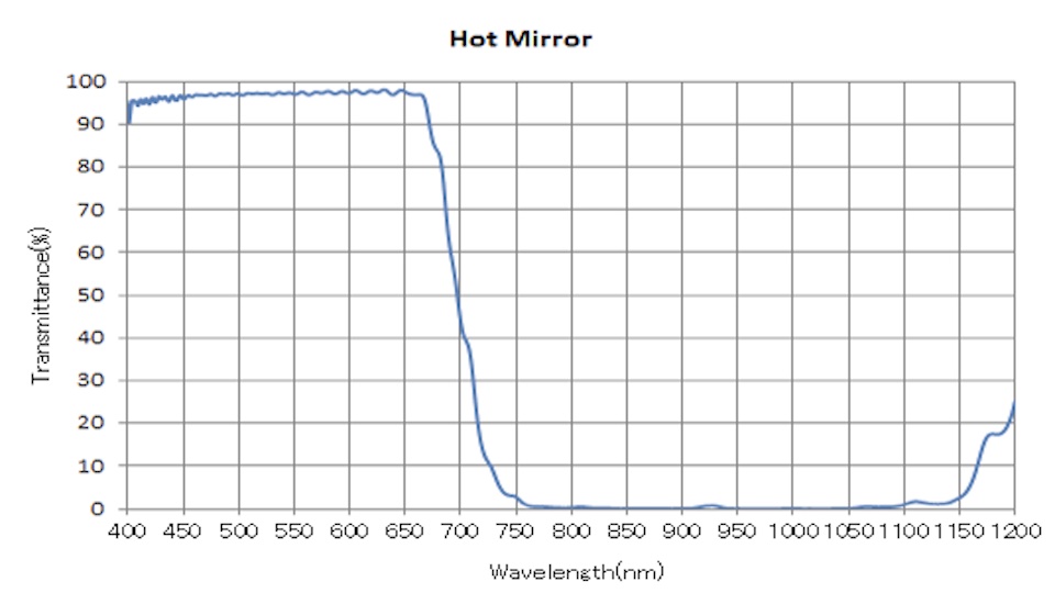 ホットミラー 赤外線を反射し可視光を透過させる多層膜をつけた鏡です。 投影器や照明装置など、赤外線による温度上昇が懸念される場合に使用されます。 例として、赤外波長を95%以上反射させ、可視光域は90%以上透過させる誘電多層膜コートが施されているミラーです。 投影器や照明装置など、赤外線による温度上昇が懸念される場合に使用されます 分光データ 使用用途 照明機器 活用事例 医療機器