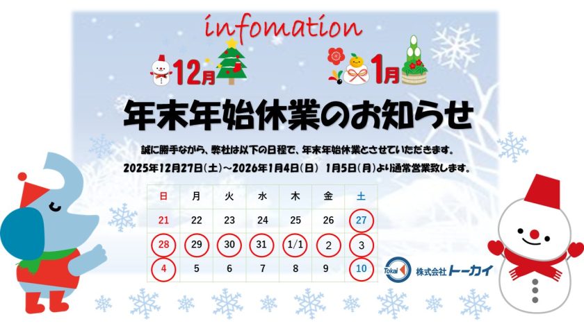 株式会社トーカイの広報担当です。年末年始期間中の休業日のお知らせです