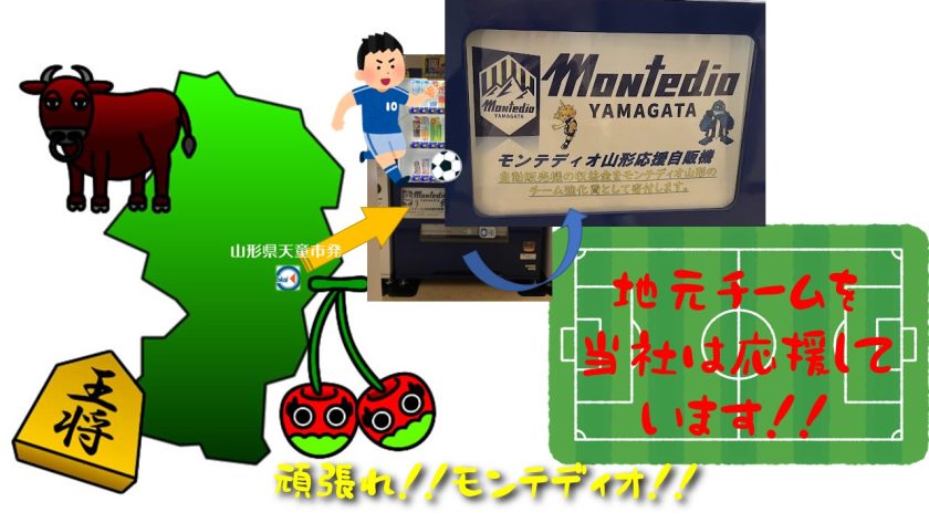 自動販売機で購入すると、その一部がモンテディオ山形のチーム強化費として寄付される仕組みです。当社 社員も応援しています!!