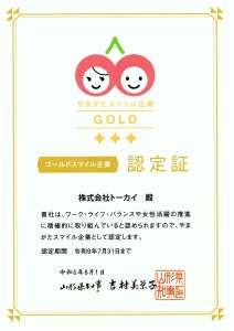 弊社は、2024年8月1日付けで、山形県の「やまがたスマイル企業認定制度」において、「ゴールドスマイル企業」に認定されました。