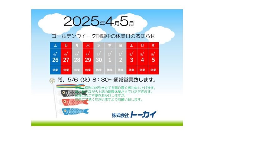 弊社のゴールデンウイークのスケジュールをお知らせいたします。休業中はご不便をおかけしますが、何卒ご理解いただけますようお願い申し上げます。