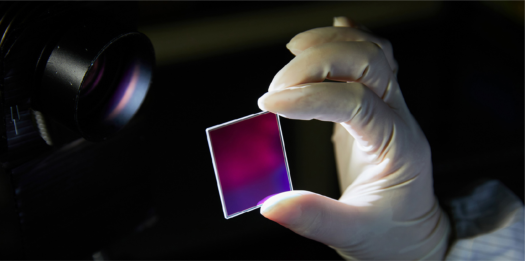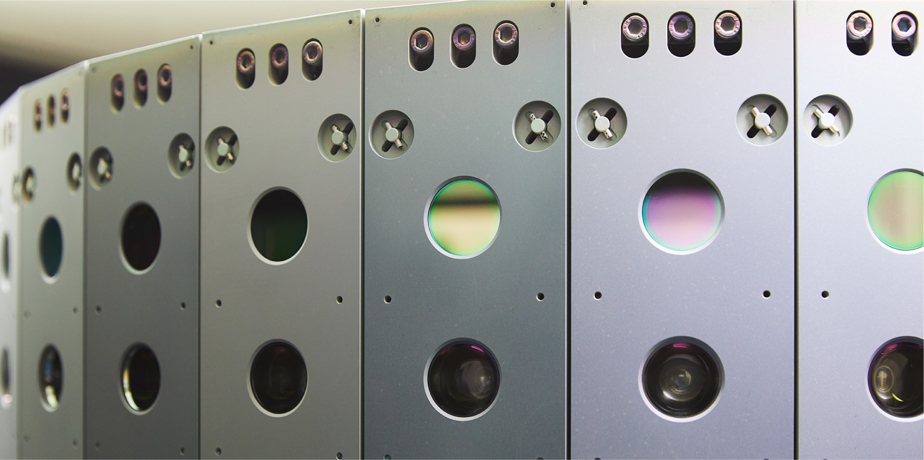 複数の蒸発源を個々に電子ビームで加熱蒸発させるエレクトロンビーム(EB)をはじめ、高密度・高密着で波長シフトのない成膜が可能なイオンアシスト(IAD)、低温成膜で波長シフトのない高品質な光学薄膜を得ることができるスパッタリング(Sputtering)などの設備を駆使して、最先端薄膜加工を行っております。