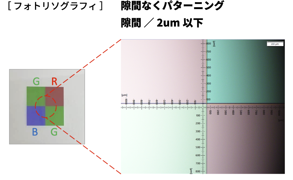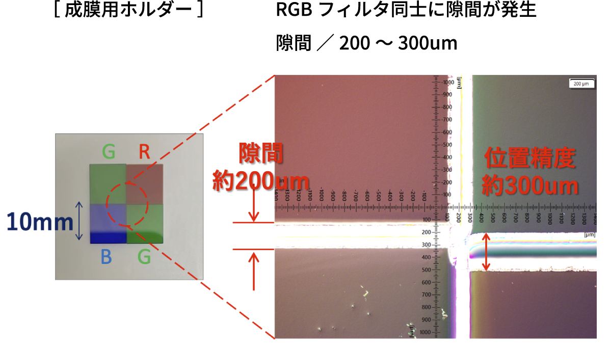 従来の「成膜用ホルダーでの遮蔽」に比べ、「フォトリソグラフィ」の方が位置精度が高く、フィルタ間の「隙間」が抑えられています。