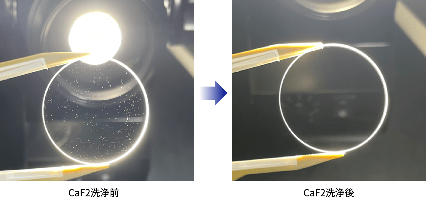 これまでの軟硝材の洗浄は溶剤による手拭きが一般的でしたが、当社の高性能超音波設備により洗浄が可能となりました。一般硝材からCaF2やFPL51等の高摩耗度の軟硝材まで、ガラスの洗浄は何でもお気軽にご相談下さい。