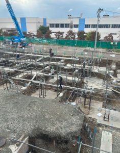増築工事エリアでは、鉄骨の柱を建てるにあたり、足場が組み立てられてきました。いつもと違うアングルからパチッと撮影!!