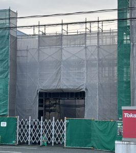 鉄骨がある程度建ち、防炎シートで囲われました。外からは、逆にあまり見えにくくなりましたが、これはこれで圧巻です。